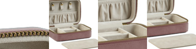 100% recycled polyester velvet. Recycled polyester velvet lining.Main zip compartment.High shine gold metal zip.Internal pocket and compartments.Necklace compartment.Three secure necklace hooks.Earring and ring rolls.Removable decoration panel.Designed to store rings, earrings and necklaces.Tear out label.