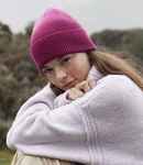 100% recycled polyester. Recycled micro fleece lining. Basket weave knit. Double layer knit. Cuffed design. Cotton twill patch for decoration. Self colour pom pom. Tear out label.