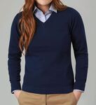 60% Cotton, 40% Acrylic 12 gauge knit. V-neck, long sleeve, ribbed neck, tubular cuff and hem, contrast inner neck strip