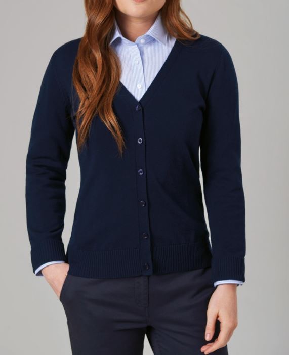 60% Cotton, 40% Acrylic 2 gauge knit. V-neck, ribbed placket, cuff and hem, contrast inner neck strip