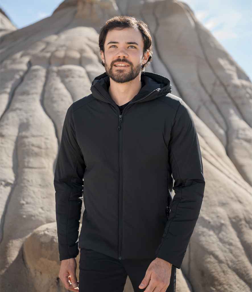 90% recycled nylon/10% spandex poplin. 84% recycled polyester/16% spandex side panels. Recycled polyester lining. High loft synthetic thermal insulation. Lightweight. High-density brushed back knit panels. PFC-free DWR showerproof finish. Windproof. Grown on adjustable hood. Full length zip with chin guard and inner zip guard. Underarm gussets. Articulated elbows. Contoured seams. Two front zip handwarmer pockets. Adjustable drawcord hem. Branded.
