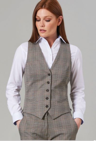 64% Polyester, 34% Viscose, 2% Lycra. Tailored fit, 5 button front, 2 welt pockets, part lining back with adjuster. Centre back length at size MED = 51.5cm