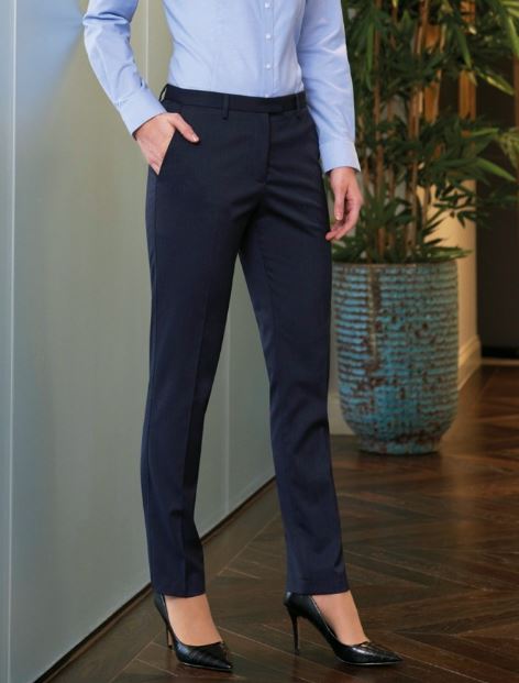 63% Polyester (30% Recycled), 34% Viscose, 3% LYCRA® Elastane. Slim leg, plain front, 2 slant side pockets, 2 double jet hip pockets Half hem width at size 12R = 16cm