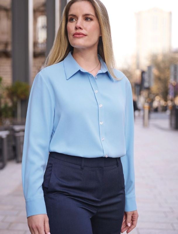 Long sleeve, button front, 2 button single cuff, classic collar, dipped front and back hem.