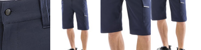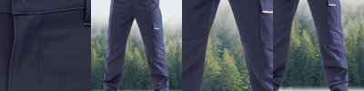 Elastomultiester fibres.Soft and wrinkle free stretch fabric.Moisture wicking properties.Slim fit.Side elasticated waistband with high back and belt loops.Zip fly with rivet.Reinforced ruler pocket.Hammer loop.Multi compartment thigh pockets.Expandable back pockets.Articulated knees.Treble stitched critical seams.Tag free.