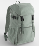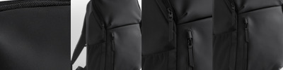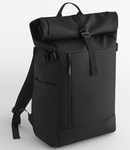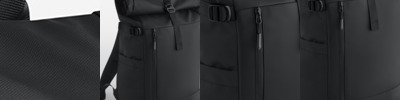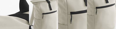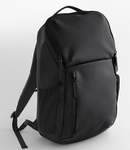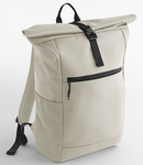 Matte-look PU coating.Recycled polyester lining.PVC free.Water resistant fabric and zips.Minimalist styling.Grab handle.Padded adjustable shoulder straps.Roll-top closure.Cord zip pulls with reflective detail.Padded back panel.Main zip compartment.Front zip pocket.Elasticated mesh side pockets.Laptop compatible up to 16".Tear out label.Capacity 20 litres.