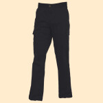 Extendable waistband with belt loops. Zip fly with stud button over. Two side pockets. Rear pockets with flaps. Media pocket. Cargo pocket on right leg.